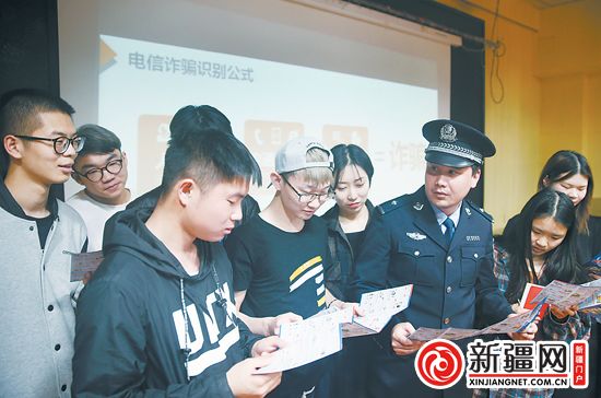 4月18日,烏魯木齊市天山區公安分局民警走進新疆藝術學院、新疆大學進行掃黑除惡宣傳,通過實際案例向學生講解電信詐騙的特點。