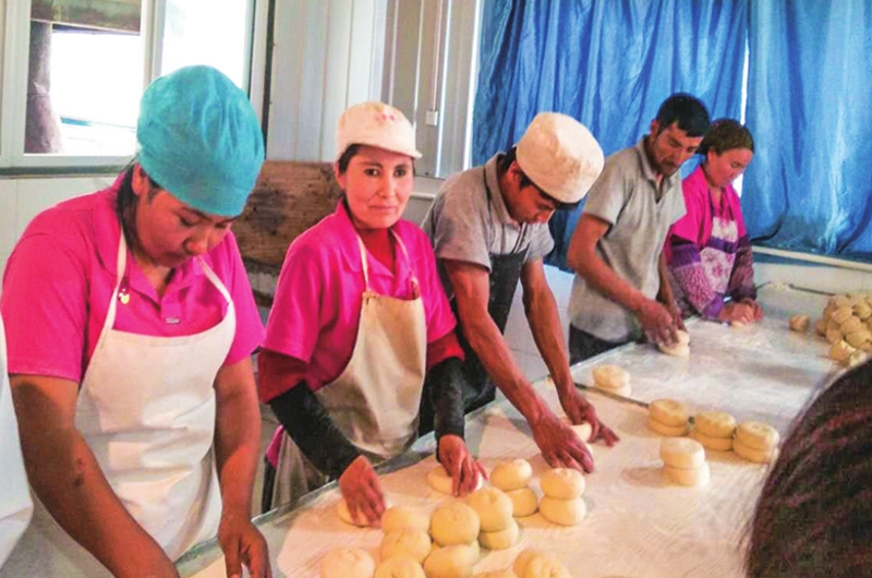 阿瓦古麗·居馬克(左二)正在打馕廠揉面。圖由新疆維吾爾自治區(qū)林業(yè)和草原局駐阿拉薩依村“訪惠聚”工作隊(duì)提供。