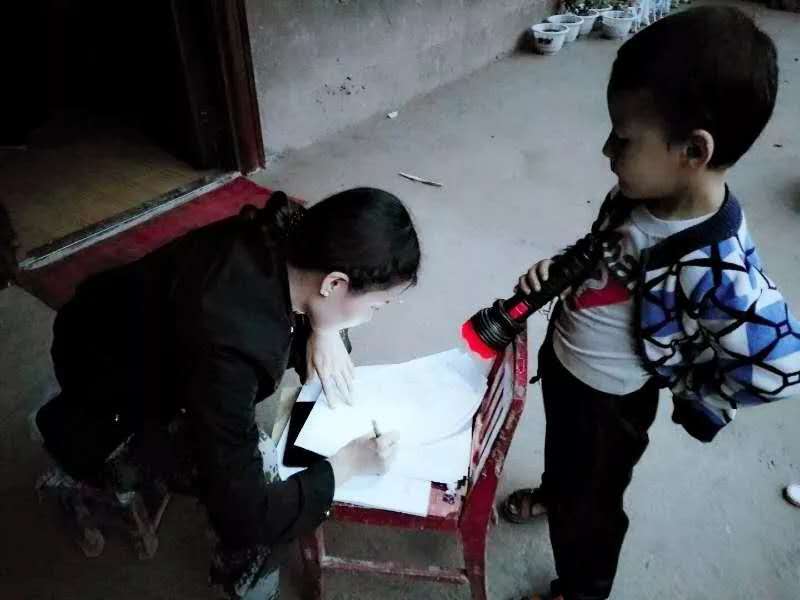 “有一次我與同事入戶走訪,因為停電只能趴在室外的椅子上填寫表格。天色越來越暗,字跡越變越模糊時,突然一束光照在紙上,原來是我6歲的小親戚努爾阿力木·托合提喀日舉著一支手電筒為我照明。本以為這只是孩子的一時興起,堅持不了多長時間,沒想到他一直堅持到我填完表格。累了,就用手扶著腰算是休息一下……