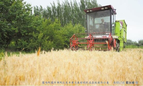 農民阿布拉江·司馬義家種植20畝小麥,他開著小型收割機忙碌著。“一天就能將小麥全部收割完,加上脫顆機脫粒,預計不到5天就可以全部完成,機器比人工省時省力。”阿布拉江臉上洋溢著豐收的喜悅,“在農技人員的指導下,對小麥進行科學種植管理,從平整土地、選購種子到灌溉,預計每畝產量約350公斤至400公斤,比往年增產幾十斤。小麥收割完,我準備復播玉米,良種已經選好了。”