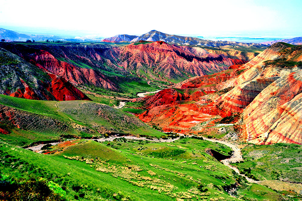 新疆烏蘇市天山峽谷,五顏六色的雅丹地貌與綠色草原融為一體,構(gòu)成了一幅美麗的油畫(huà)畫(huà)卷。美好的綠色生態(tài)環(huán)境、強(qiáng)烈的色彩反差對(duì)比,令人陶醉。