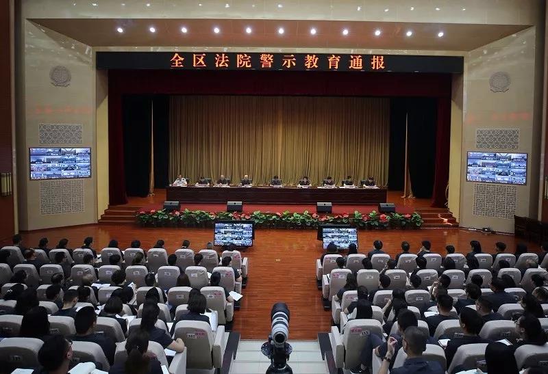 高院領導班子全體成員及機關全體干警在高院大法庭參加警示教育。各分、中院及基層人民法院全體干警在各地通過視頻形式參加警示教育。