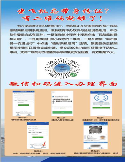 “辦理電子臨時乘機證明有三種方式,可以在微信小程序點擊‘民航臨時乘機證明’,或者在機場航站樓掃描二維碼,按照提示進行操作。”烏魯木齊國際機場安全檢查總站旅檢二室副主任馬曉璇介紹說。