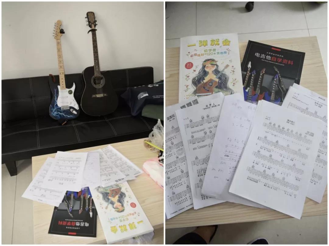 藥品的后面擺著余樂兒子的照片,茶幾的另一端有吉他自學書籍和一些樂譜,細看有《追夢人》《情非得已》《多年以后》等,最顯眼的是靠在沙發背上的兩把吉他。