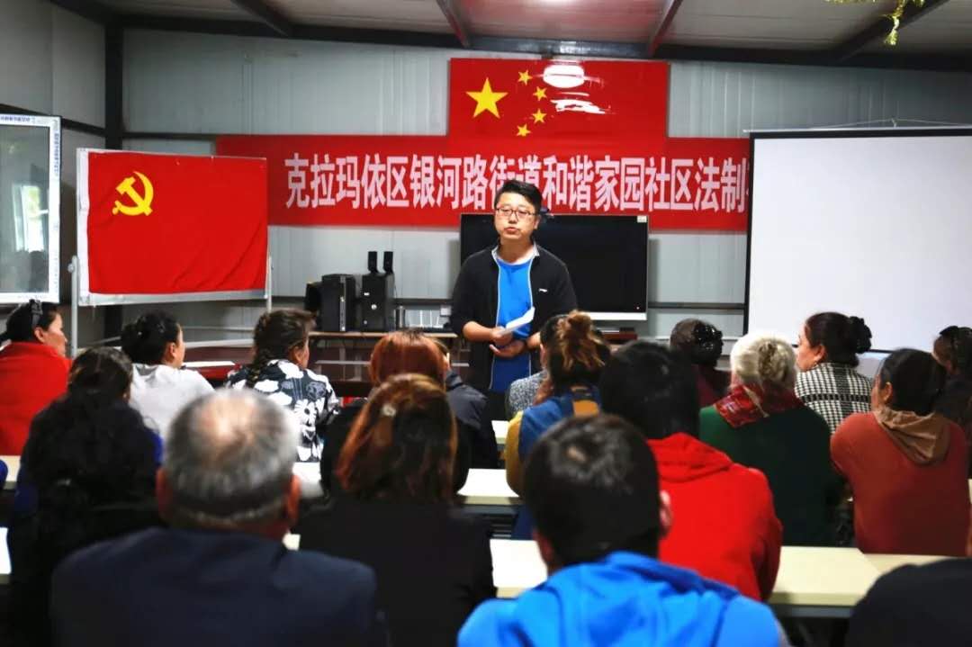 2017年春,克拉瑪依市委政法委駐和諧家園社區(qū)“訪惠聚”工作隊入駐社區(qū)后,開辦了和諧學(xué)校,教居民學(xué)習(xí)國家通用語言文字,宣傳黨和國家的惠民政策,舉辦法律講座。讓沒上過學(xué)的人學(xué)會了寫自己和孩子的名字,加強(qiáng)語言溝通能力,居民們聽課的積極性越來越高,經(jīng)常座位不夠坐,一些人站著也要聽。