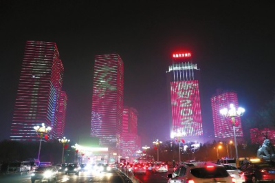 紅山西大橋片區(qū)燈光秀以時代廣場、紅山新世紀、中信大廈等建筑為依托,展現(xiàn)出喜慶熱烈的新年氣氛。在LED燈裝扮下的樓宇五彩斑斕,樓體上各種圖案不斷變換,不時滾動出現(xiàn)的“我們的中國夢”等字體分外醒目。
