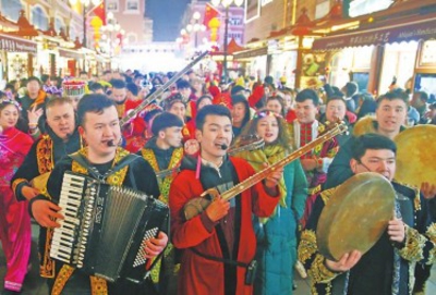 歡快的手鼓、悠揚的手風琴、輕快的舞步……在大巴扎步行街,百余名演員帶來歌舞巡游表演。