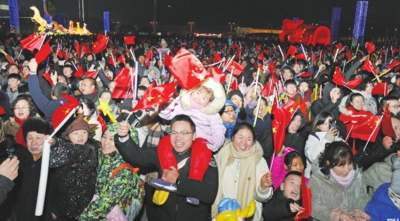會展中心廣場上,大屏幕出現(xiàn)“10、9、8、7……”新年倒計時時,廣場上近萬游客齊聲高唱《我愛你中國》。
