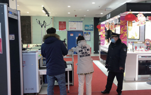 1月28日,大年初四,在匯嘉時代超市和商場入口處,記者看到工作人員手持體溫檢測儀對進入商場和超市的每一名顧客進行體溫檢測,并檢查口罩佩戴情況。