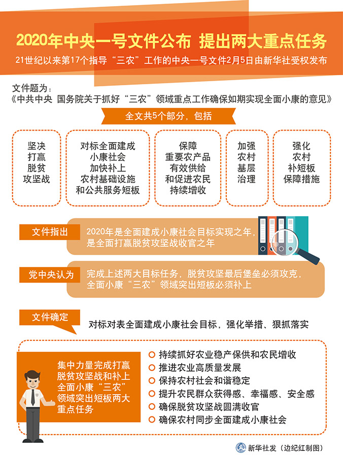 文件確定,對標對表全面建成小康社會目標,強化舉措、狠抓落實,集中力量完成打贏脫貧攻堅戰和補上全面小康“三農”領域突出短板兩大重點任務,持續抓好農業穩產保供和農民增收,推進農業高質量發展,保持農村社會和諧穩定,提升農民群眾獲得感、幸福感、安全感,確保脫貧攻堅戰圓滿收官,確保農村同步全面建成小康社會。