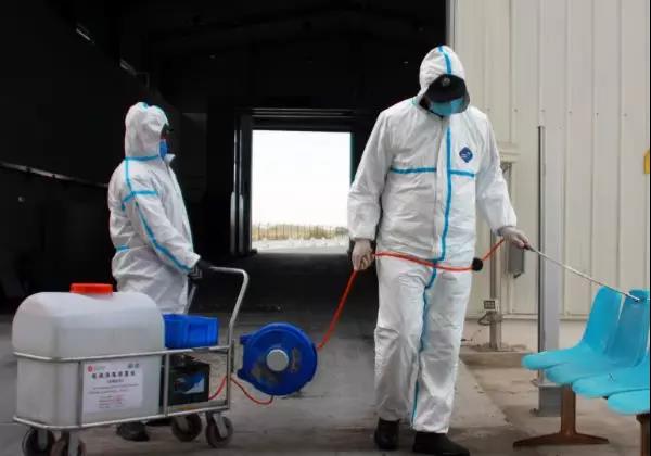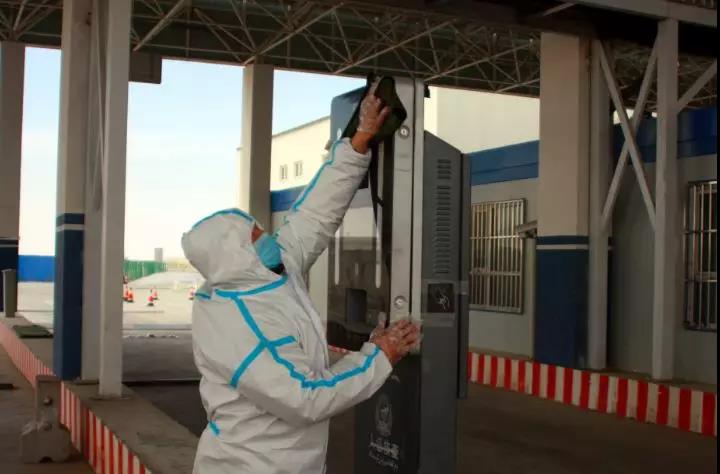 當日上午,記者趕到距離和田市區180公里左右的紅白山公安檢查站采訪看到,在陣陣寒風中,穿著白色的防護服公安干警,用消毒藥水認真仔細地對檢查車道、座椅、人行通道等進行消毒,確保不放過任何一個角落。