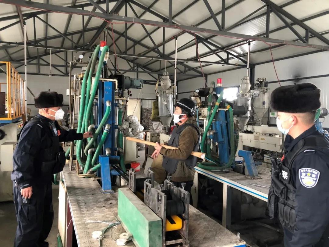 2月15日一早,賈依河帶著民警來到了轄區雙泉村滴灌帶廠開展安全生產檢查。他們聯合防疫部門,指導滴灌帶廠儲備口罩、消毒液等防控物資,健全生產、經營、食宿等場所疫情防控設施設備,落實企業員工健康信息錄入和每日定時健康打卡登記制度,要求用工企業在疫情防控期間,嚴格控制“非必須”類會議和集體活動,嚴格要求返崗上班的工作人員一律佩戴口罩,做好個人和公共區域衛生防護管理。