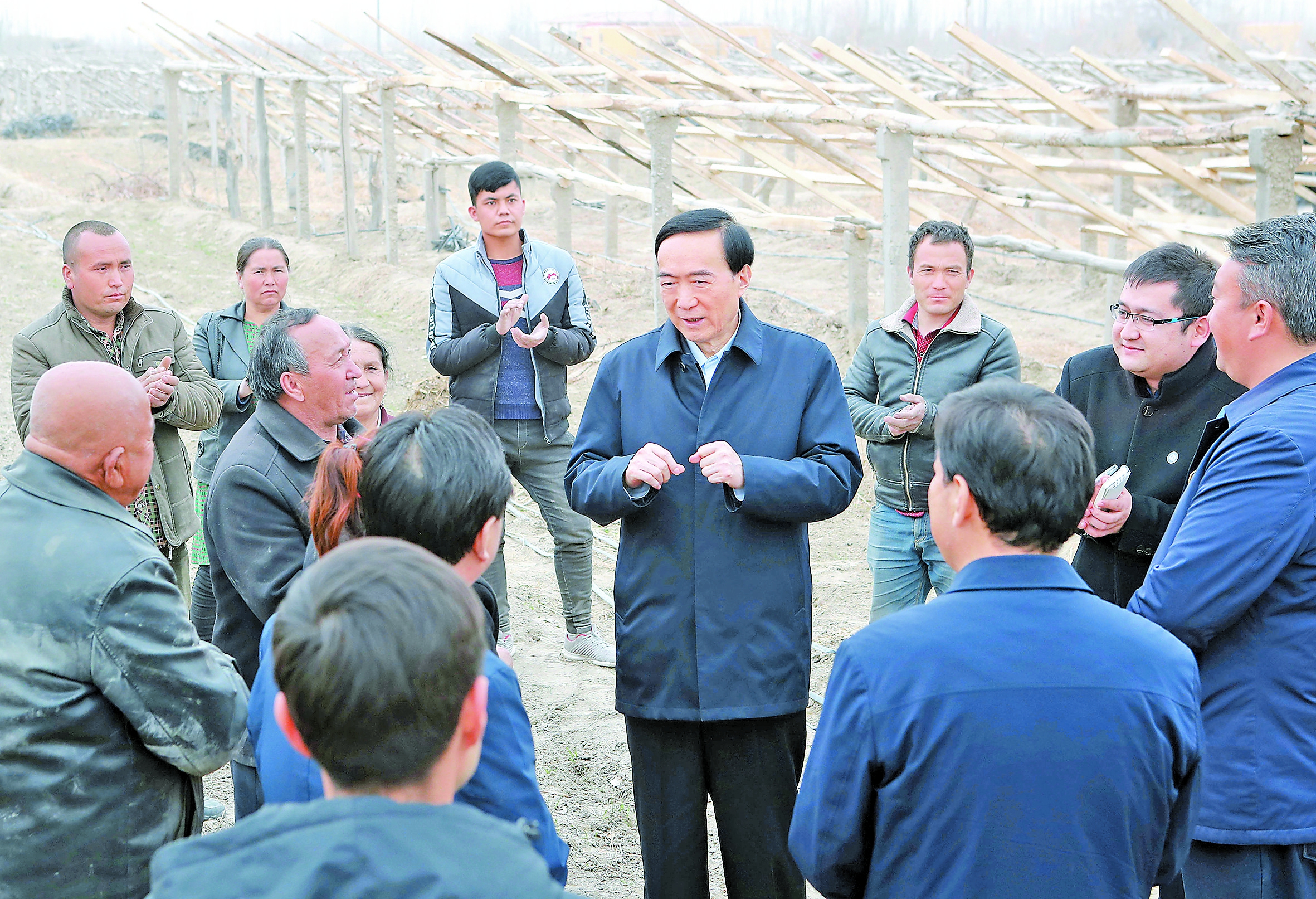 3月10日至11日,自治區(qū)黨委書記陳全國來到所負(fù)責(zé)的深度貧困縣于田縣,進村入戶、訪困問需,實地開展脫貧攻堅掛牌督戰(zhàn)。這是陳全國在蘭干鄉(xiāng)玉吉米力克村和正在田地里勞作的村民們親切交談,關(guān)切詢問農(nóng)資保障、田間管理、產(chǎn)出收益等情況。 新疆日報全媒體記者 崔志堅攝