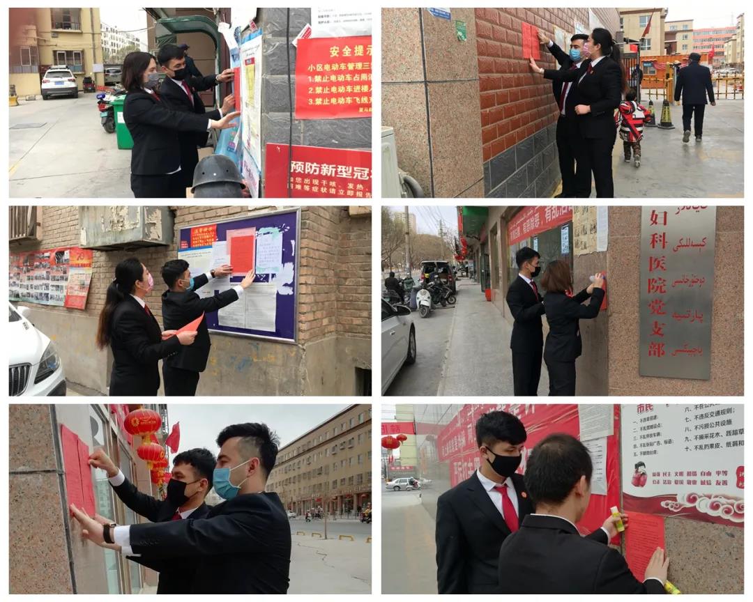 隨著 “勇于應戰,讓黨徽在一線閃耀”的口號在喀什中院立案服務大廳響起,支部書記一句:“出發”,活動拉開序幕。由第一黨支部支委帶隊的三個小組12人,分別前往喀什市市內的行政服務大廳、醫院、商場、住宅小區等地方,在顯眼處張貼提前印制好的《新疆維吾爾自治區喀什地區中級人民法院關于新型冠狀病毒感染肺炎疫情防控期間審判工作安排的公告》海報。