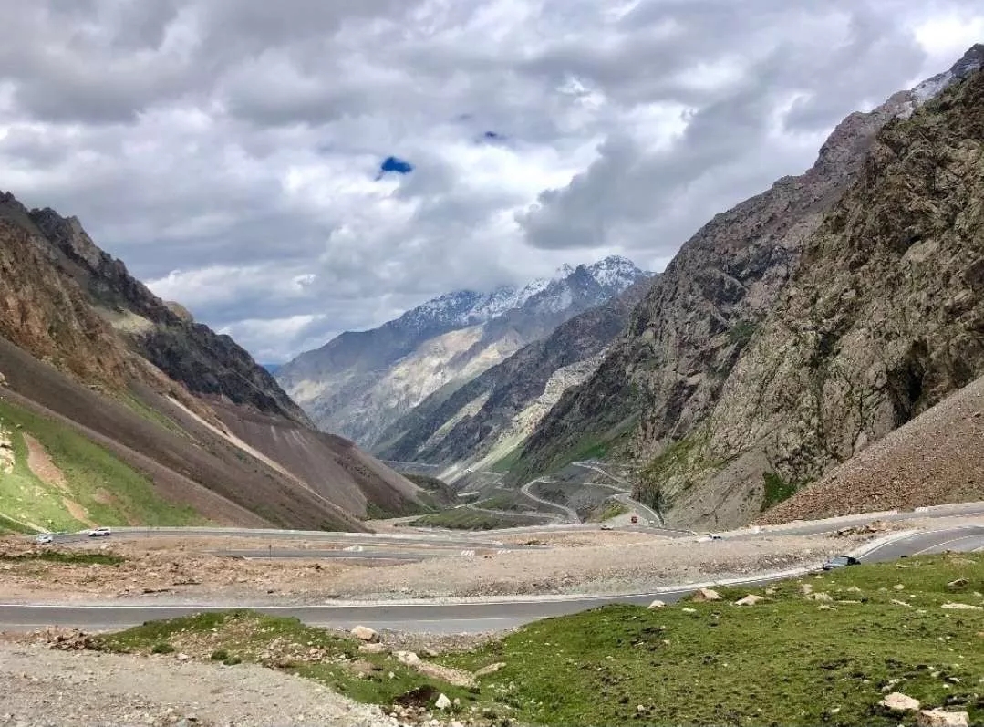 往“老虎口”走周圍都是黑魆魆的懸崖絕壁,狀山頂望不到頭,路也如蛇形盤旋。從“老虎口”過后,我們抵達了烏蘭薩德克檢查站,再往前走就是夏西勒克雪山了,溫差大,千年積雪的山峰,蜿蜒顛簸的路,有時一場雪后,路上結得都是冰雪。