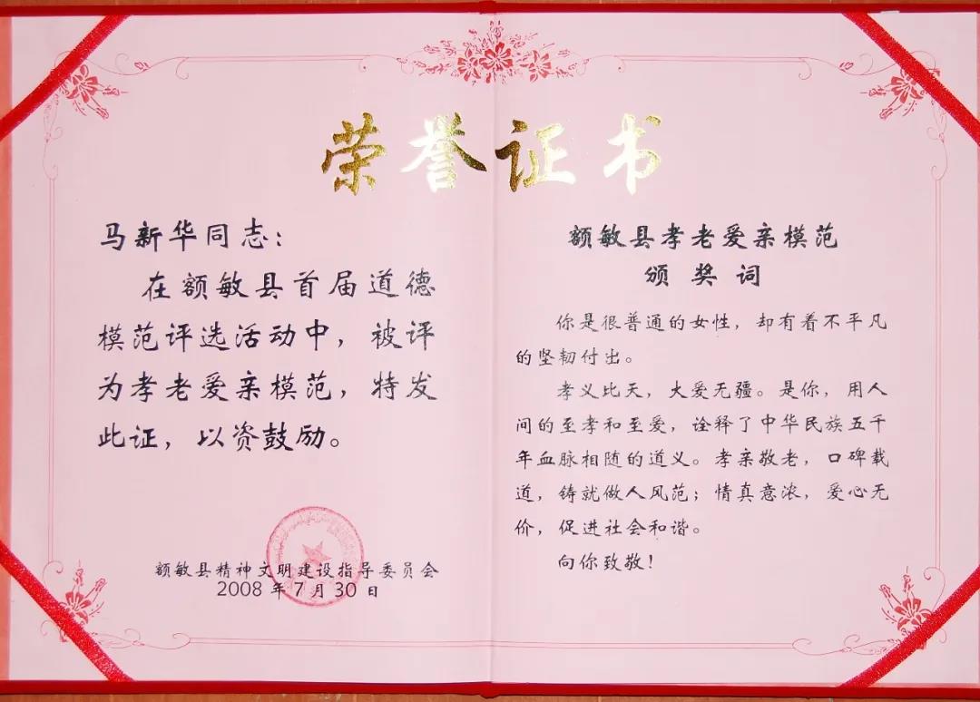 在額敏縣,馬新華和漢族爸爸楊吉春的故事成為一段佳話。2008 年額敏縣評選首屆道德模范,馬新華被評為孝老愛親模范。