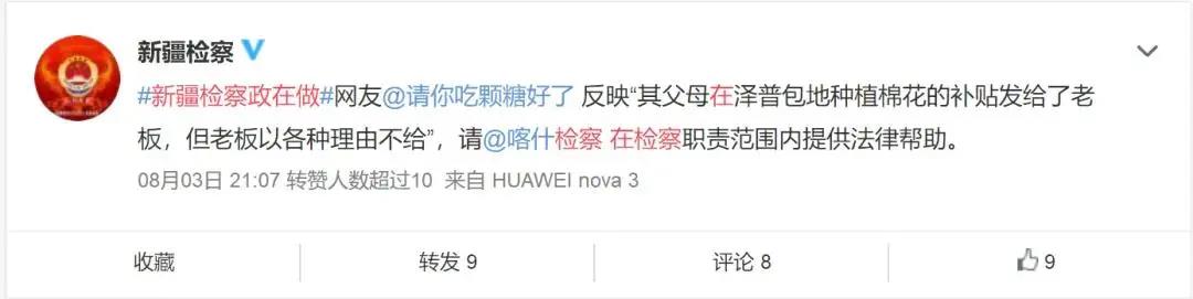 8月,網友通過新浪微博向“@新疆檢察”反映,其父親去年包地種棉花,其補貼被老板扣著不發,和老板鬧得關系很僵,先后找有關部門進行了調解,均無結果,希望檢察機關給予幫助。