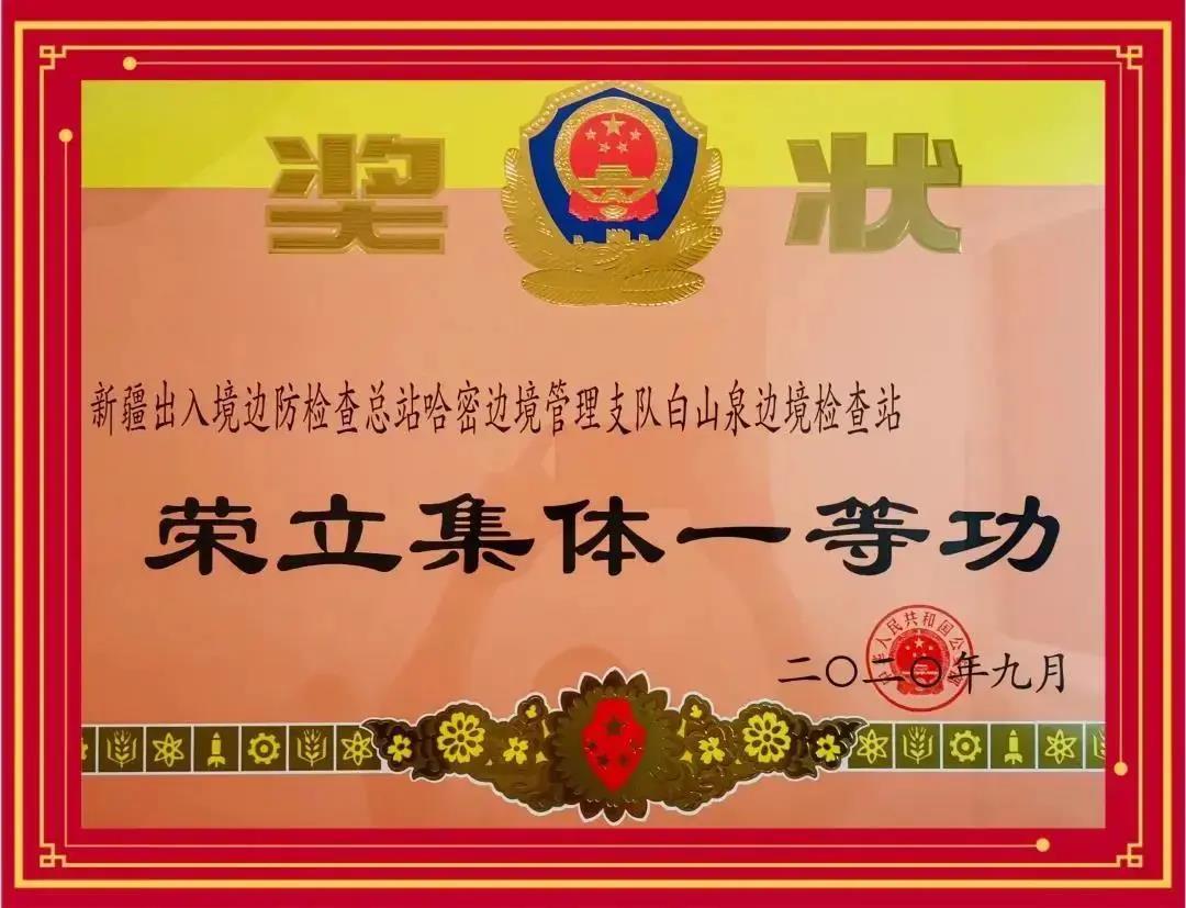 近日,公安部為新疆出入境邊防檢查總站哈密邊境管理支隊白山泉邊境檢查站榮記集體一等功。