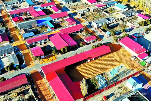 10月16日,塔城地區塔城市也門勒鄉闊克加依達克村農民房前屋后曬滿了豐收的玉米。金色的玉米與紅色的屋頂相互映襯,組成亮麗的鄉村風景線。