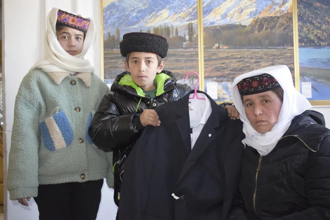 阿米娜和都爾汗坐在衣物旁,用手輕輕地撫摸著衣服,兒子拉迪爾倚在媽媽身邊不語。