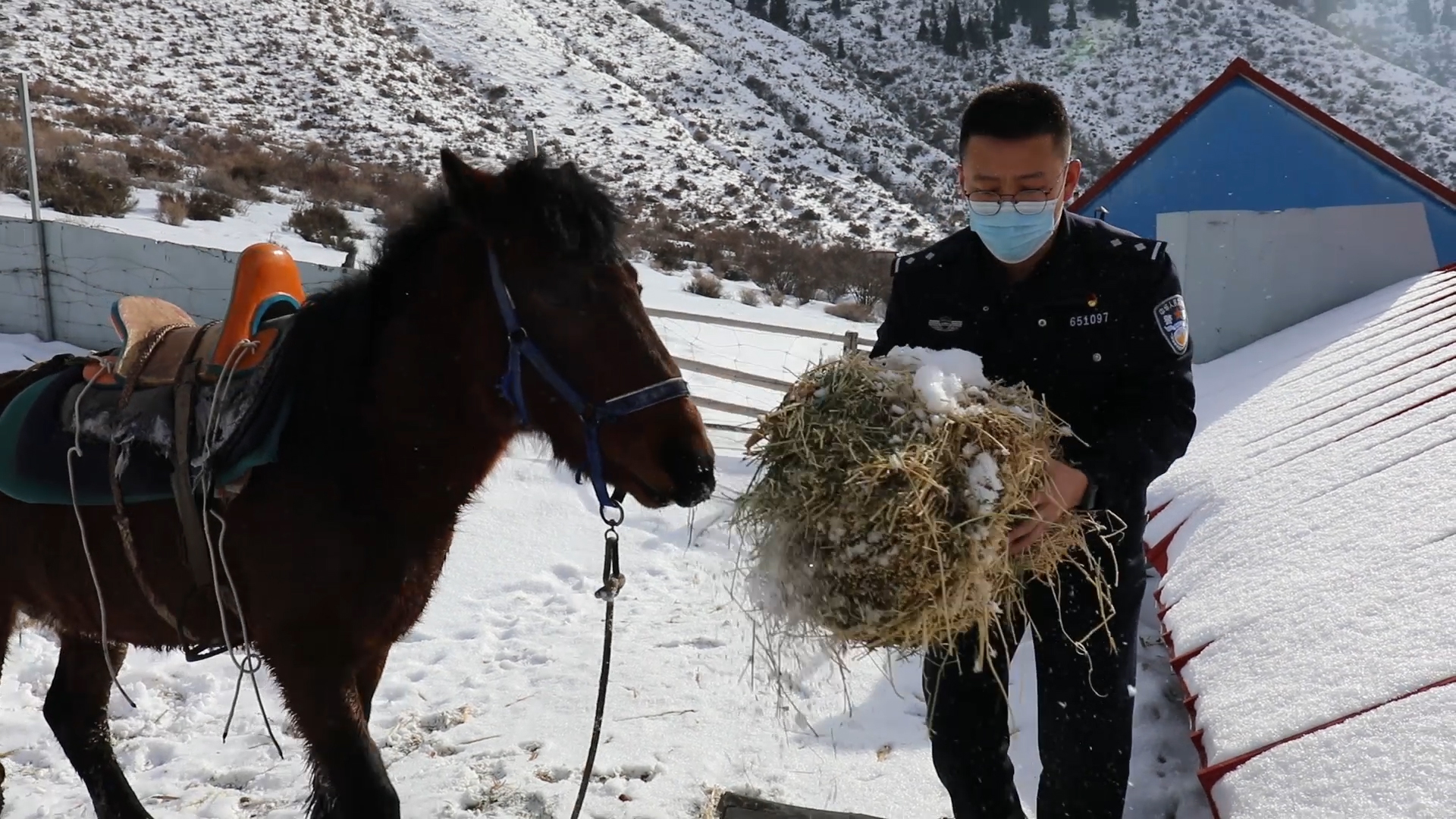 山路被雪封了,車上不去,蘆勝磊就聯(lián)系當?shù)剡吘尘瘎照荆埱缶瘎照揪o急支援,用馬馱送貨的辦法,走了10個來回,用時6個小時,終于將2噸草料全部運到甫·何新家中,待他們下山回到警營,太陽已落山。