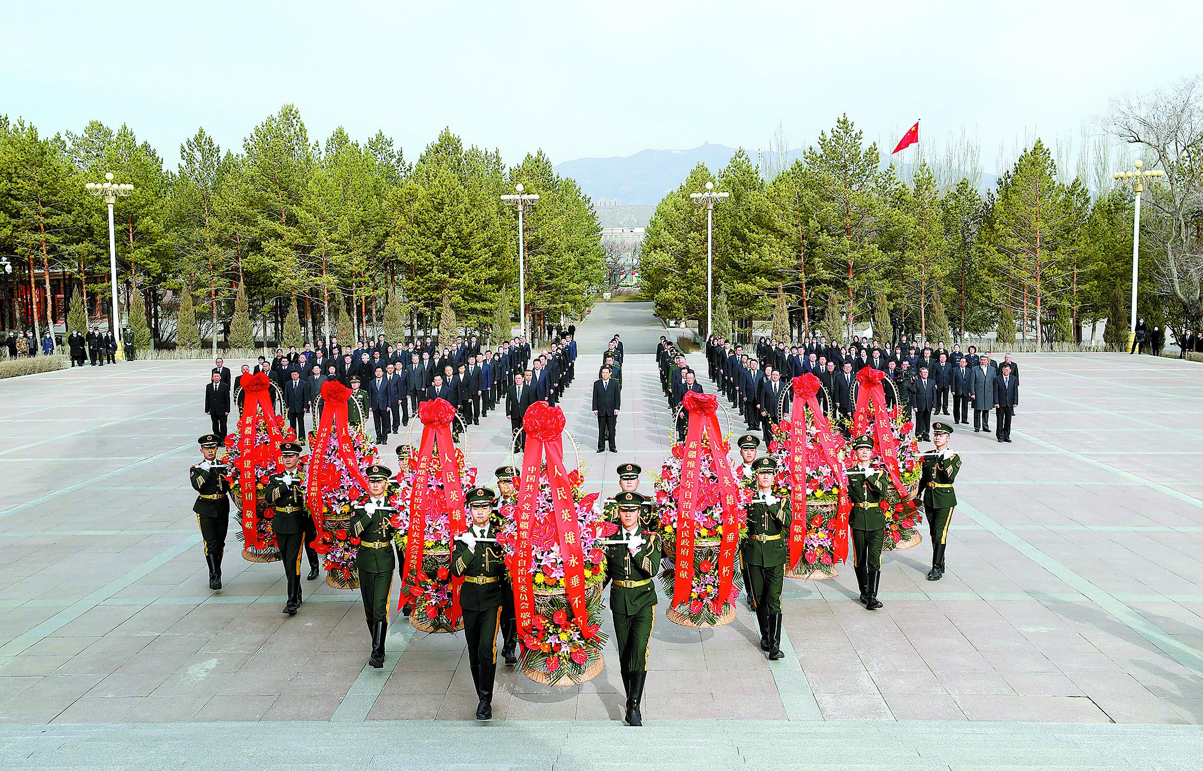 烏魯木齊市烈士陵園莊嚴肅穆、松柏環繞、豐碑矗立。10時45分,向人民英雄敬獻花籃儀式正式開始。全場肅立,向為新疆解放和建設事業英勇獻身的烈士、在反分裂斗爭和反恐維穩斗爭中英勇獻身的烈士默哀。