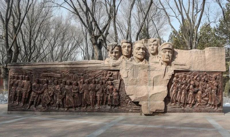 行至《紅色記憶》雕塑墻處,上面生動刻畫著新疆各族群眾和中國人民解放軍一起載歌載舞慶祝解放的場景。雕塑墻上端是代表社會各階層的五位典型人物的頭像,他們眼神充滿力量,表情依然堅定,代表著新疆各民族相處融洽、互幫互助。
