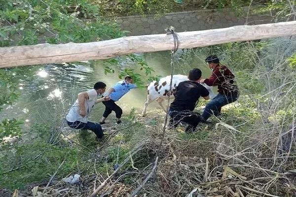 4日,伊犁哈薩克自治州伊寧縣公安局薩木于孜派出所英阿瓦提警務室接到轄區村民報警:在東支干渠,一頭牛失足掉入水中被困。