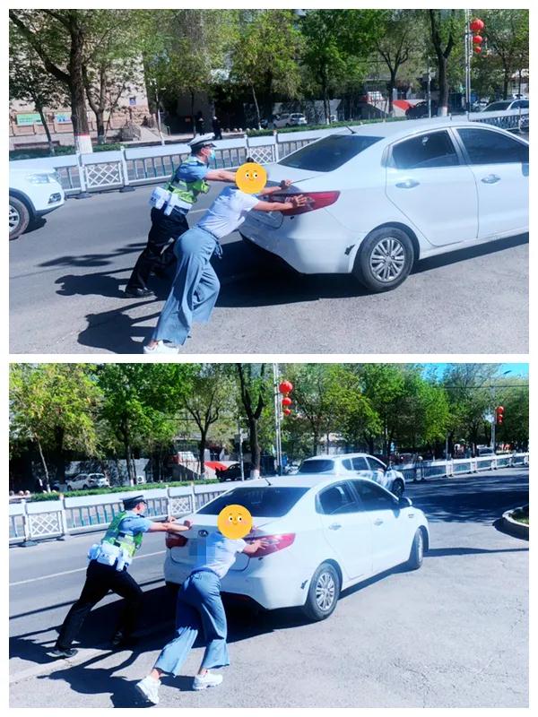 5月5日,昌吉市延安南路第五小學(xué)路段一輛小汽車發(fā)生故障,不能正常行駛,昌吉市公安局交警大隊(duì)執(zhí)勤民警發(fā)現(xiàn)情況后,立即向駕駛?cè)肆私馇闆r,并與車輛駕駛員一起將故障車輛推行至路邊安全地帶,隨后指揮、疏導(dǎo)前后車輛直至道路恢復(fù)暢通。