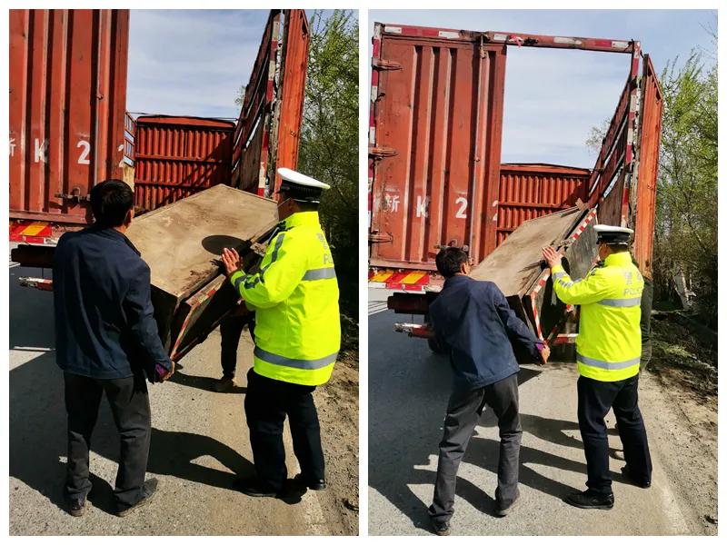 5月4日,昌吉市公安局交警大隊(duì)民警執(zhí)勤時(shí)看到一輛貨車停在路邊,民警上前了解情況時(shí),貨車司機(jī)說(shuō):“因?yàn)橹背鲩T,沒有好好檢查車輛就出發(fā)了,結(jié)果路途顛簸,箱子就掉出來(lái)了,自己一個(gè)人也抬不動(dòng)?!泵窬⒓磶椭緳C(jī)把箱子搬到車上,并加以固定。