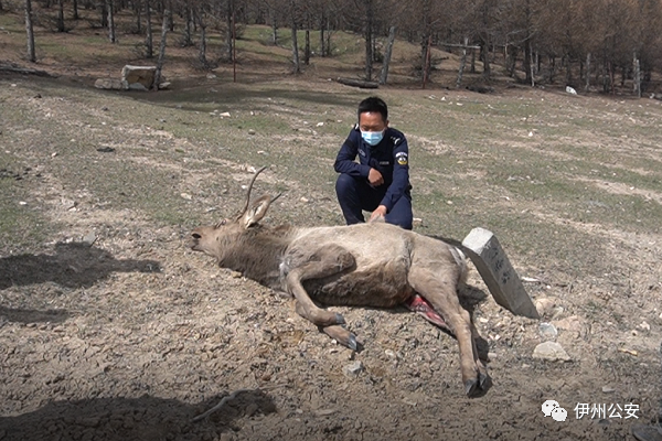 5月6日,哈密市伊州區公安局白石頭派出所民警在303線巡邏發現一只野鹿掛在路邊護欄上,警務人員立刻停車上前查看情況。