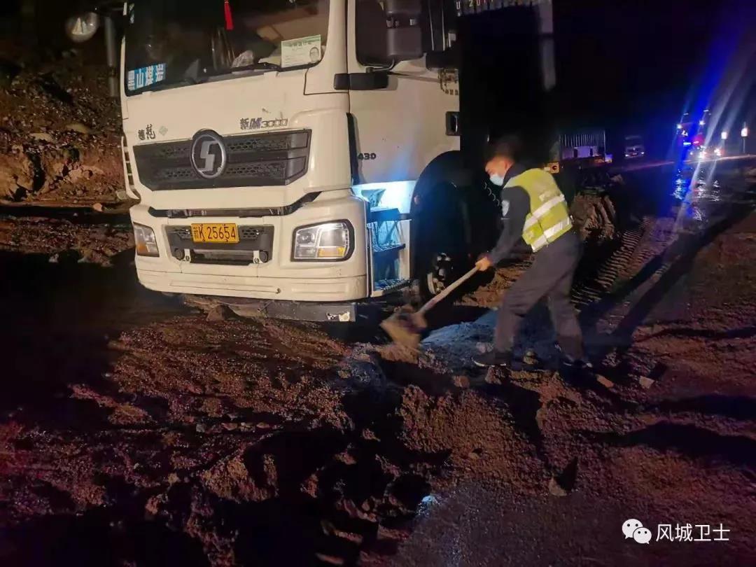6月13日凌晨1時許,吐魯番市托克遜縣轄區(qū)突發(fā)強(qiáng)降雨,省道103線二道溝路段出現(xiàn)泥石流險情,道路交通阻斷。托克遜縣公安局交警大隊(duì)巡邏執(zhí)勤民警冒著暴雨趕往事發(fā)地點(diǎn),發(fā)現(xiàn)該路段已被泥土、沙石淹沒,3輛半掛牽引車被泥沙埋住了輪胎,無法挪動。