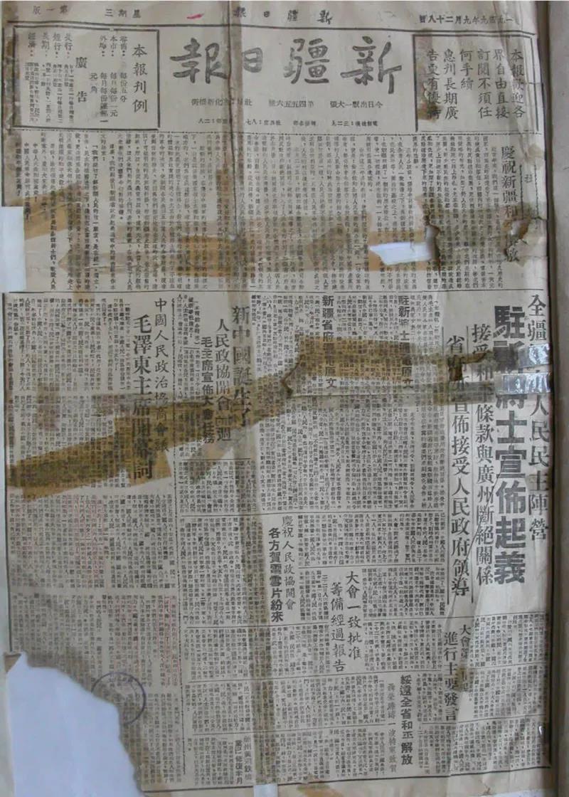 翻開1949年9月28日的《新疆日報》,社論《慶祝新疆和平解放》與《全疆歸向人民民主陣營——駐新將士宣布起義》的稿件出現在頭版醒目位置。