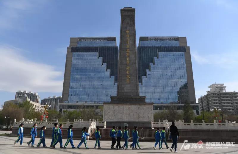 5月1日,烏魯木齊人民廣場,綠樹環抱,鳥兒啁啾。老人們圍坐在樹蔭下品茶、聊天,年輕人捧書慢讀。正值假日,不少疆內外游客來到這里,只為瞻仰廣場上的“中國人民解放軍進軍新疆紀念碑”。