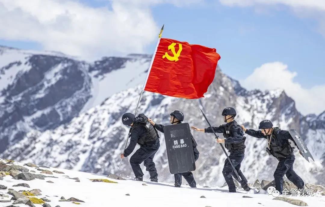 6月22日,新疆出入境邊防檢查總站博爾塔拉蒙古自治州邊境管理支隊(duì)溫泉邊境管理大隊(duì)莫斯吾邊境警務(wù)站民警在海拔3960米的莫斯吾冰達(dá)坂頂風(fēng)巡邏,讓黨旗飄揚(yáng)在邊境前沿。(蘆勝磊)