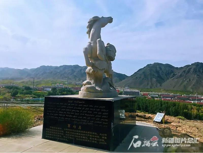 在伊吾縣城西面的圓盤山上有一座漢白玉雕塑,一匹馬馱著水桶,兩只前蹄高高騰起,仿佛要使出渾身力氣爬上陡峭的山峰。旁邊是一座墳墓,墓碑刻著“軍功馬墓”紅字。幾十年來,不知道有多少人聽這匹馬的故事時流下了眼淚。