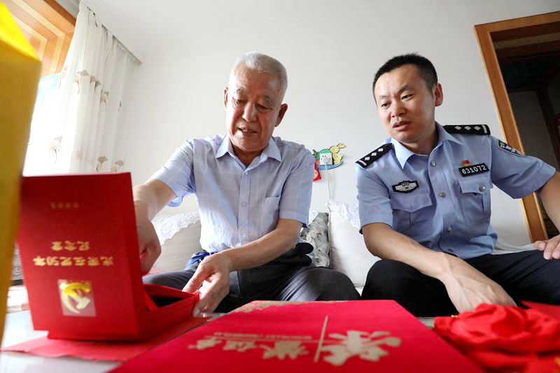 7月22日,新疆出入境邊防檢查總站阿勒泰邊境管理支隊民警走訪“光榮在黨50年紀念章”獲得者馬立明老黨員。