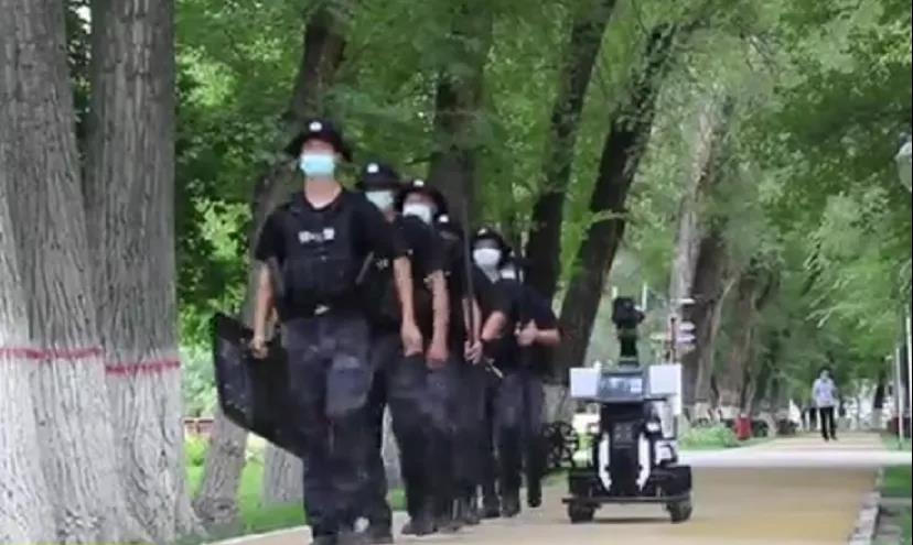 7月23日上午,塔城地區塔城市首個警用機器人在塔城市文化廣場上崗執勤時,引來眾多市民駐足圍觀,對于這位新“警員”十分好奇和歡迎。