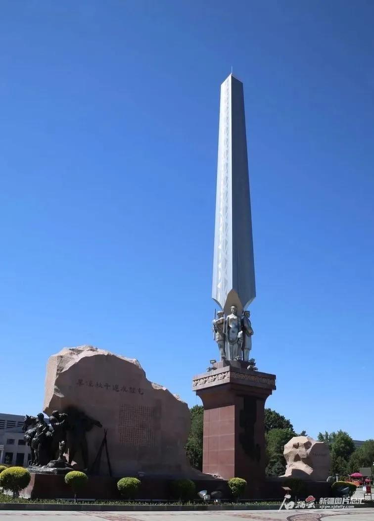6月2日,在石河子市軍墾廣場上,屯墾戍邊紀念碑高高聳立。正值盛夏,不少疆內外游客在紀念碑前合影留念,撫今追昔。