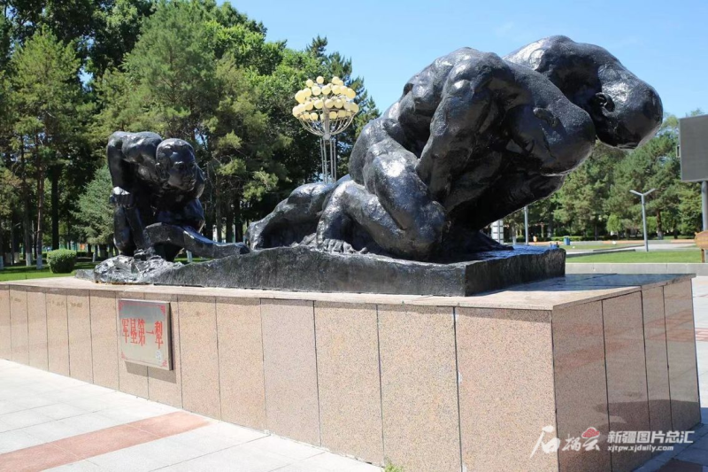在石河子市軍墾廣場西側,靜靜佇立著“軍墾第一犁”雕像。三個裸露上身的墾荒戰士奮力拉犁,深陷的雙腳、勾起的腳趾和暴起的筋肉,展現出當年戰士們生產勞作的火熱場景。