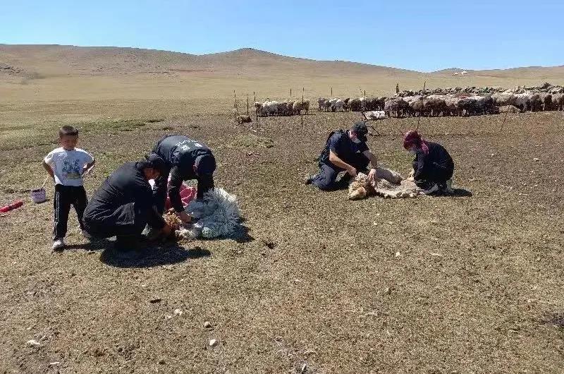 了解這一情況后,7月31日,“流動警務室”民警合理調配,組織警力上門充當“理發師”,幫助木某解決實際困難。經過木某的講解和示范,民輔警們逐漸掌握了修剪羊毛的技巧要領,紛紛上手參與修剪工作。經過大家一天的努力,共修剪羊毛800余斤,成功為羊群脫掉了厚重的“毛衣”。