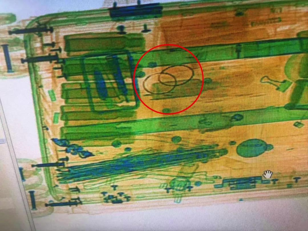 偵察員到達(dá)南充北站后,立即調(diào)取嫌疑人譚某進(jìn)站時(shí)所攜行李箱通過安檢儀的掃描成像,通過比對(duì)發(fā)現(xiàn),其行李箱內(nèi)多出了一對(duì)圓環(huán)狀疑似耳環(huán)的物體。