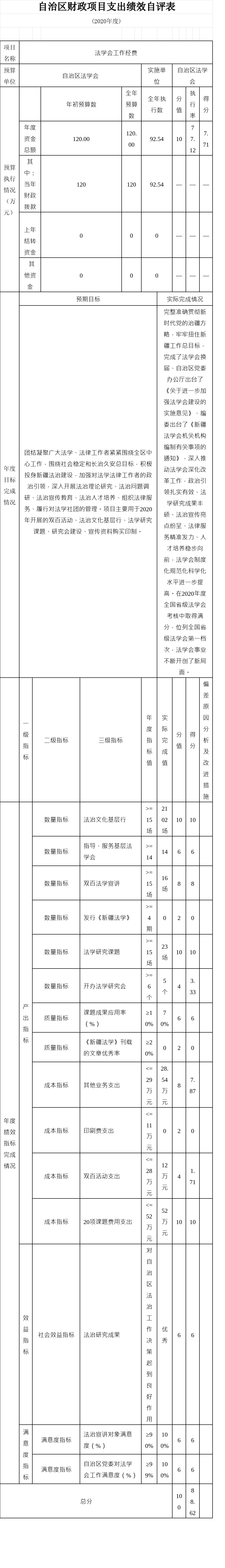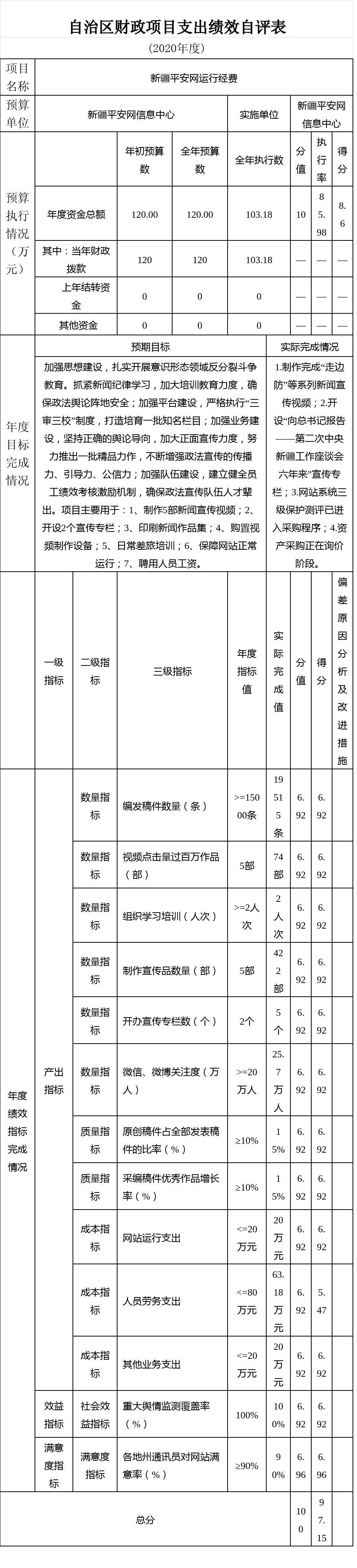 根據預算績效管理要求,我單位2020年度開展預算績效評價項目2個,共涉及資金195.72萬元。預算績效管理取得的成效:一是通過加強預算績效管理各個環節的制度建設,進一步牢固樹立“花錢必問效,無效必問責”的績效管理理念,進一步明確績效管理職責分工。二是通過加強績效管理內部控制工作,規范權利運行、降低資金效益風險。三是通過加強績效評價成果應用,壓減項目支出,進一步促進各部門履職效果和資源配置正向關聯。發現的問題及原因:一是預算管理制度流程尚需優化;二是績效理念有待進一步提高。下一步改進措施:一是加強預算管理的業務學習,不斷完善預算績效管理內部控制制度,優化流程管理,梳理風險點,規范權力、職責運行;二是加強宣傳培訓,提升機關文化,進一步樹立“講績效、重績效、用績效”的績效管理理念。具體項目自評情況附項目支出績效自評表。