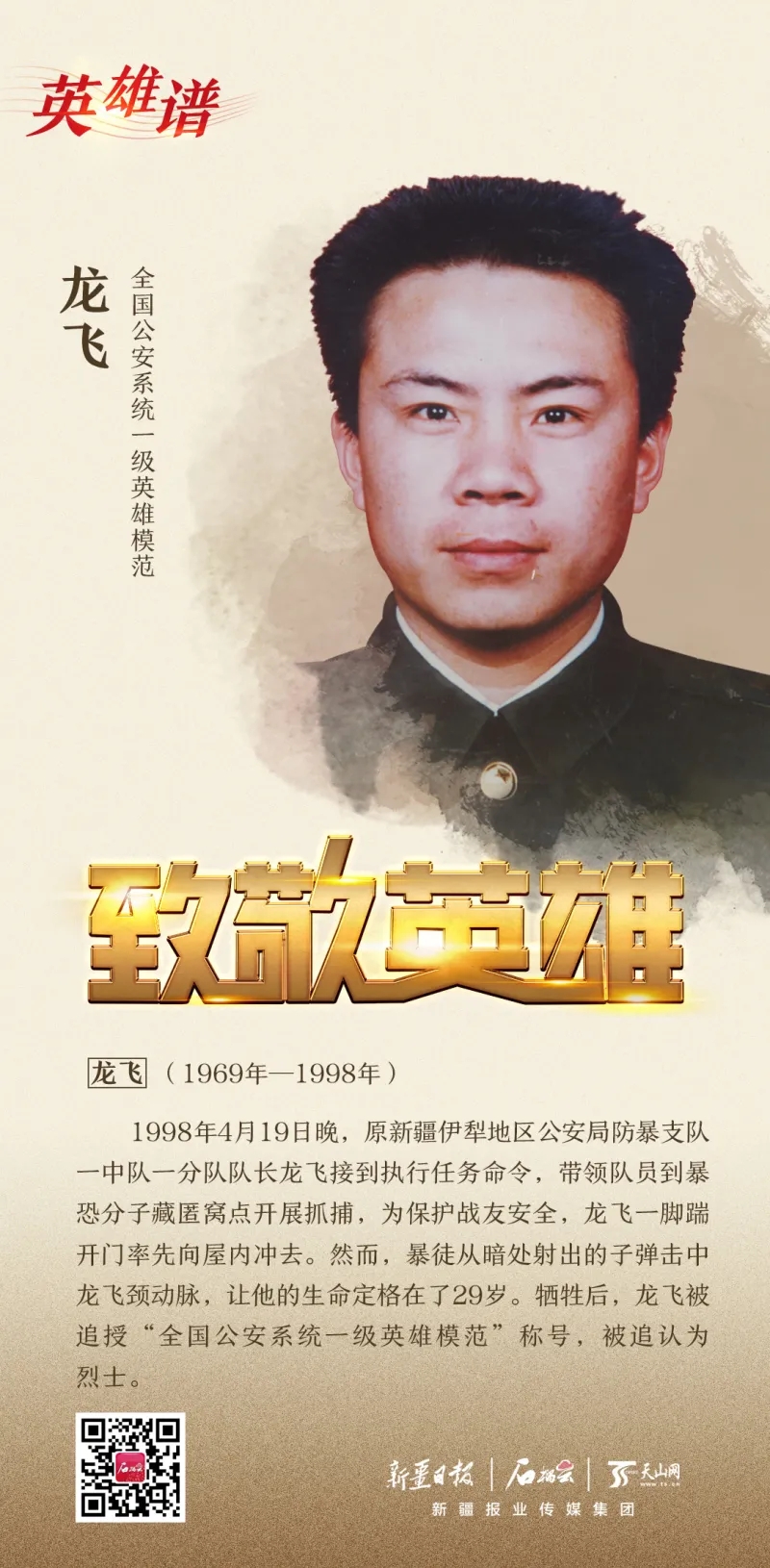 龍飛是原伊犁地區公安局防暴支隊一中隊一分隊隊長,1998年4月20日,在執行搜捕暴恐分子的戰斗任務中犧牲,生命定格在29歲。