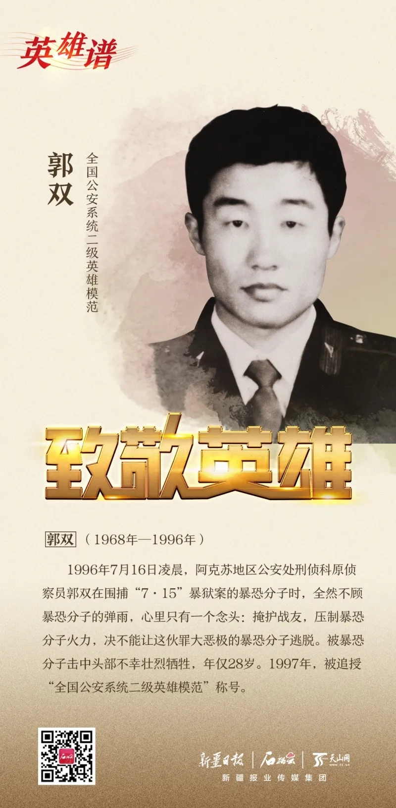 “揚警威為國捐軀盡瘁少華 反分裂衛民平暴血染大漠”,這副25年前追悼會上的挽聯,是對郭雙短暫而光輝的一生的高度評價。