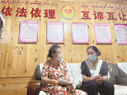 2018年,丁力努爾在自家院里騰出一間屋子,成立了以她名字命名的人民調解室,講法、解紛、收集群眾困難訴求。她說:“到我這調解的糾紛,大部分是家庭糾紛,兩口子過日子哪有不拌嘴的,找個中間人說道說道就好了。”7月初,居民阿某和老公鬧離婚,帶著孩子離家出走。經了解,阿某的丈夫長期酗酒鬧事。丁力努爾分別給兩人做工作,阿某的丈夫承諾不再喝酒,阿某打消了離婚的念頭。8月中旬,家住阿克齊社區的哈某因急需用錢,拿了家里800元,其婆婆知道后兩人吵了起來。丁力努爾通過講事實、擺道理,很快將糾紛化解,婆媳二人和好如初。