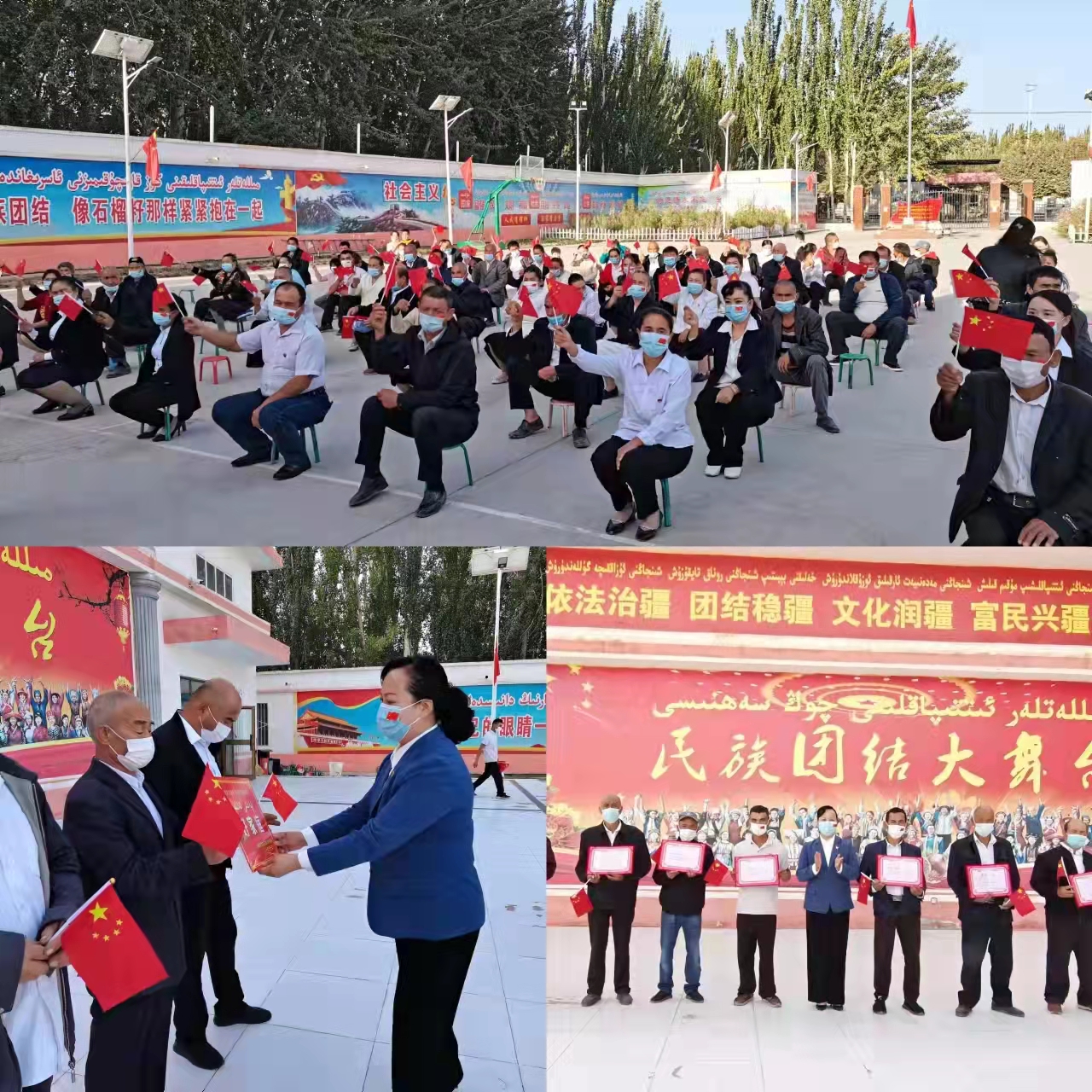 10月1日,自治區(qū)黨委政法委駐喀什地區(qū)疏附縣艾日克貝西村“訪(fǎng)惠聚”工作隊(duì)舉辦“迎國(guó)慶 感黨恩 愛(ài)祖國(guó)”主題黨日活動(dòng)。活動(dòng)內(nèi)容有:升國(guó)旗、公民宣誓、表彰優(yōu)秀志愿者、民族團(tuán)結(jié)好家庭、好村民、好鄰居、好干部、好老師、好學(xué)生。活動(dòng)中,駐村干部和村民們一起合唱《沒(méi)有共產(chǎn)黨就沒(méi)有新中國(guó)》《我和我的祖國(guó)》,共同祝愿我們偉大的祖國(guó)繁榮昌盛。
