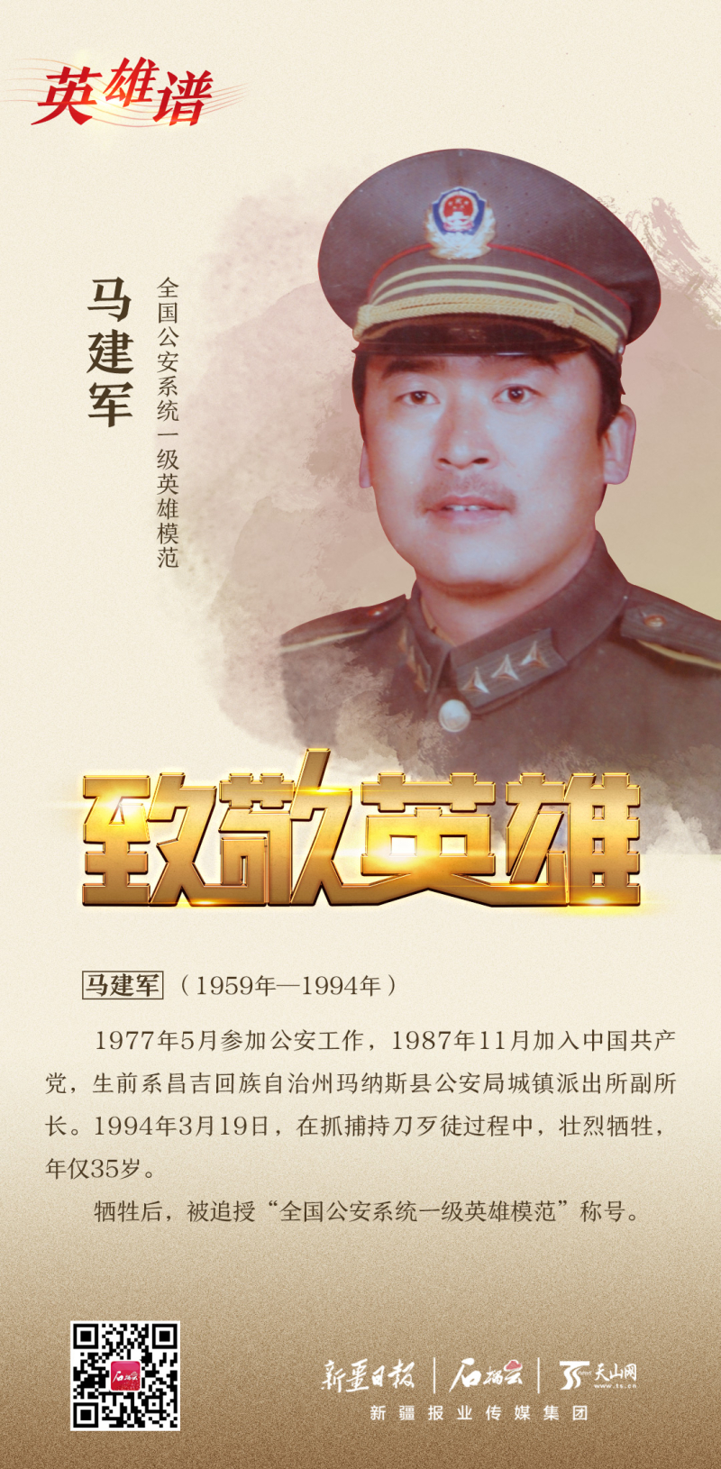 馬建軍,1977年5月參加公安工作,1987年11月加入中國共產黨,曾先后任瑪納斯縣公安局刑警隊隊長、廣東地派出所副所長、治安大隊隊長、城鎮派出所副所長等職,榮立1次三等功,受嘉獎2次,并多次被評為優秀共產黨員和先進工作者。犧牲后,被追授全國公安系統一級英雄模范稱號。