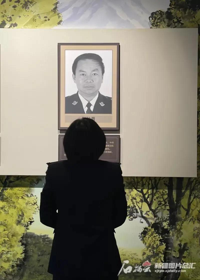 11月24日,劉全秀來(lái)到新疆警史館,凝視著丈夫趙鐘勇的遺像,淚如泉涌。這是新疆警史館建成以來(lái),她第一次有勇氣走進(jìn)去。“他沒(méi)留下幾張照片,這張還是用老照片PS(圖像處理)的。”劉全秀說(shuō)。