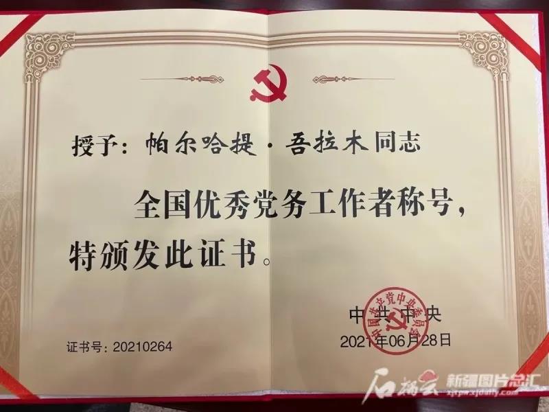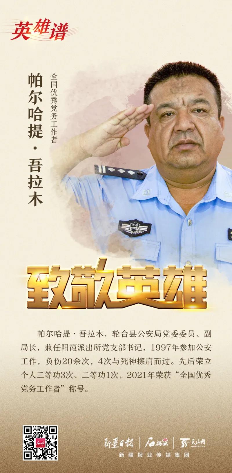 帕爾哈提·吾拉木現為輪臺縣公安局黨委委員、副局長,兼任陽霞派出所黨支部書記。1997年參加公安工作以來,他始終奮戰在基層一線,帶領民警破獲各類案件130余起,抓獲犯罪嫌疑人230余名,用自己的實際行動為維護社會穩定作出了積極貢獻。先后榮立個人二等功1次、三等功3次,2021年獲“全國優秀黨務工作者”稱號。